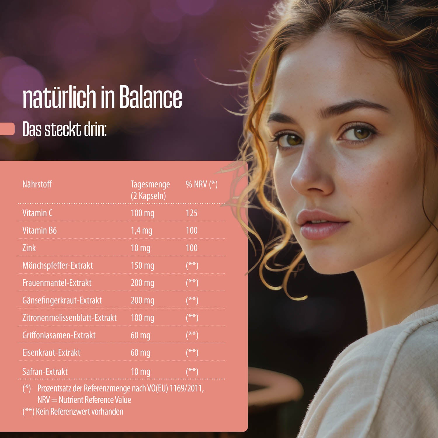 Die Rezeptur kombiniert bewährte Pflanzenextrakte wie Mönchspfeffer, Safran, Eisenkraut, Frauenmantel und Griffonia mit ausgewählten Mikronährstoffen. Gerade im weiblichen Körper wirken Hormone, Nerven- und Stoffwechselprozesse besonders fein aufeinander abgestimmt – und sind entsprechend sensibel gegenüber Ernährung, Stress und Lebensstil. Eine gezielte Versorgung mit bestimmten Mikronährstoffen kann dabei unterstützen, Wohlbefinden und hormonelle Balance zu fördern – auf ganz natürliche Weise.